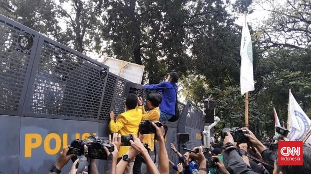 Setelahnya, polisi mendorong mahasiswa untuk mundur. Namun mahasiswa tetap bertahan dan berorasi.