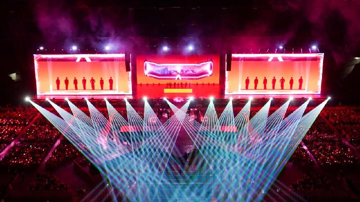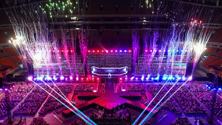Sorot lampu laser warna-warni membelah gelapnya stadion, menyatu dengan sorak ribuan penggemar. Lautan warna hijau lightstick milik para penggemar mulai berkedip dan berubah warna mengikuti pola yang terhubung oleh sistem kontrol pusat di area konser melalui koneksi teknologi nirkabel jarak pendek alias bluetooth. Barisan kembang api di depan panggung ditembakkan ke udara, menandai dimulainya pertunjukan pukul 19.00 WIB.