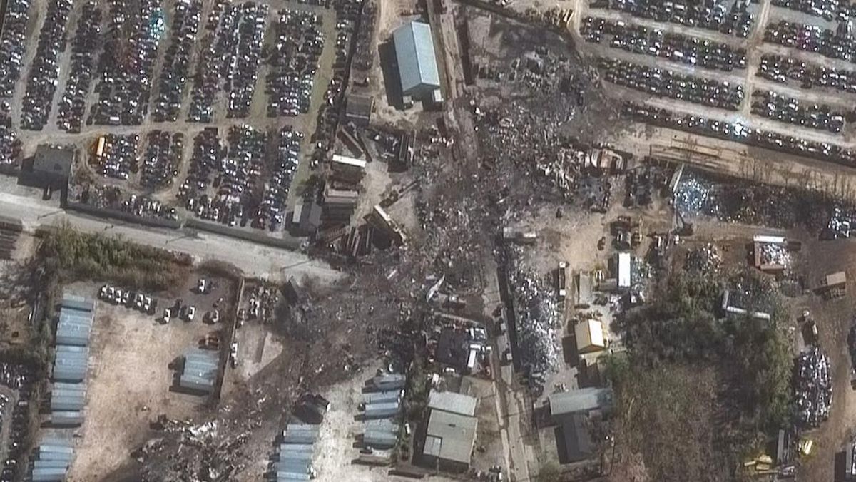 Tampak area kawasan industri di dekat Bandara Louisville juga mengalami kerusakan parah pada bangunan, dengan puing-puing yang berserakan.
