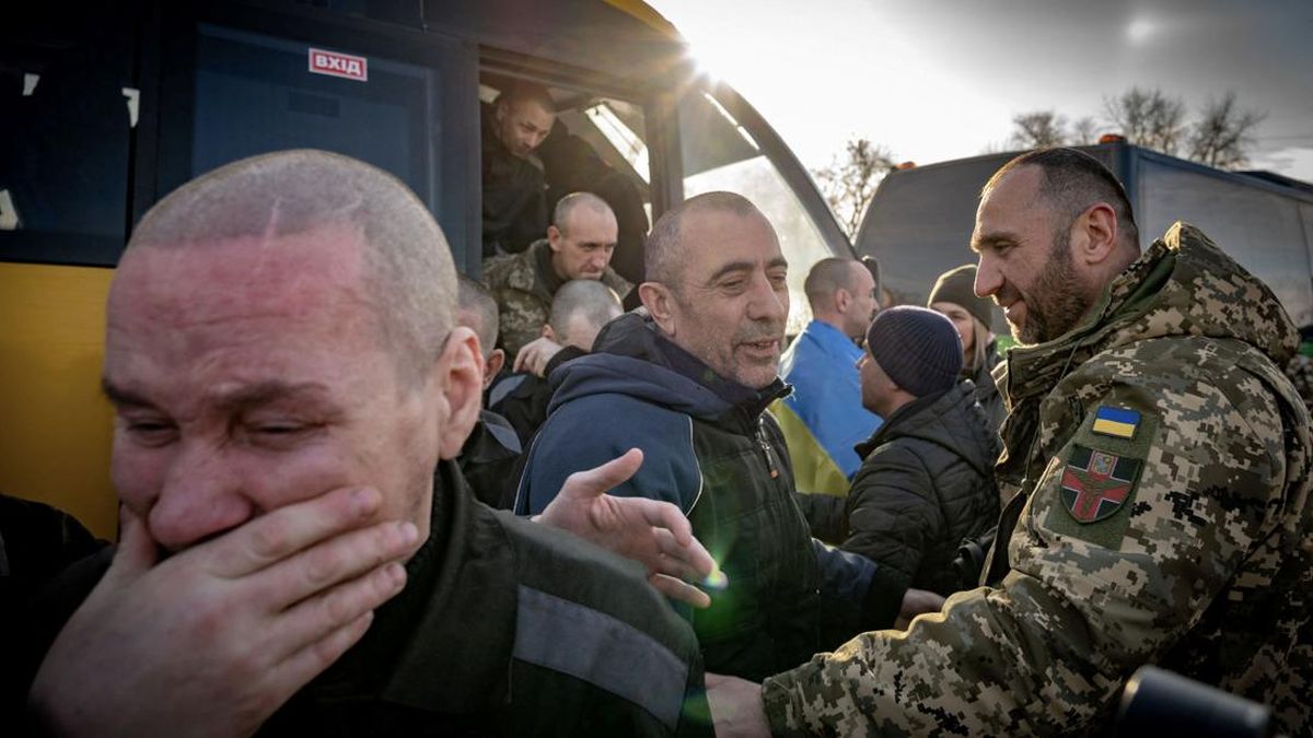 Para tawanan yang dibebaskan dibawa ke lokasi pertemuan dengan beberapa bus. Foto-foto dan video yang dirilis oleh pemerintah Ukraina memperlihatkan puluhan pria mengenakan seragam militer.