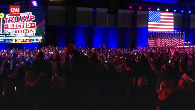 Kegembiraan dan sorak sorai terpancar dari kerumunan pendukung yang hadir ketika Trump dinyatakan sebagai pemenang.